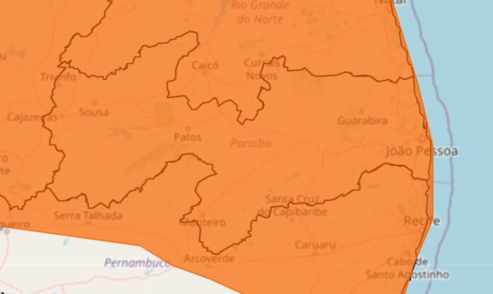 O Instituto Nacional de Meteorologia (INMET) emitiu, na manhã desta quinta-feira (12), um alerta de grau de severidade “Perigo” (bandeira laranja) cobrindo todos os municípios do estado da Paraíba. O aviso tem validade imediata e se estende até o final da noite de hoje, às 23h59.