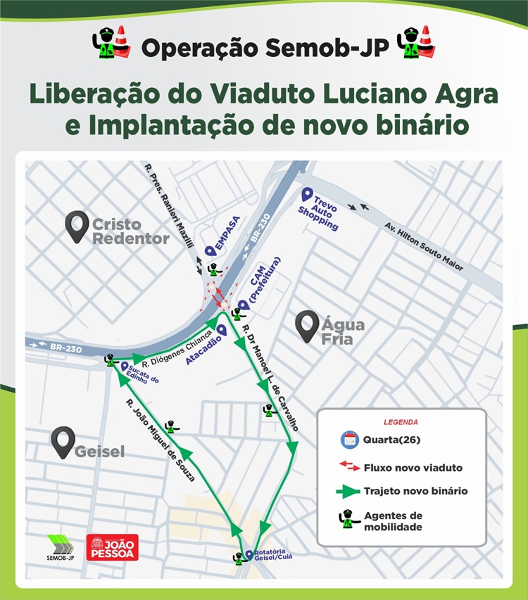 Nesta quarta-feira (26), será liberado o novo acesso entre os bairros do Cristo Redentor e Água Fria com a conclusão das obras do Viaduto Luciano Agra. Com isso, a Superintendência Executiva de Mobilidade Urbana de João Pessoa (Semob-JP), em parceria com o Departamento de Estradas de Rodagem da Paraíba (DER-PB), implantará um binário entre as ruas Dr. Manoel Lopes de Carvalho e João Miguel de Souza, no bairro do Geisel.