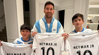 Neymar Júnior presenteou Lionel Messi e seus filhos com três camisas do Santos. Em seu perfil nas redes sociais nesta terça-feira (10), o alvinegro praiano publicou a foto do craque argentino com os itens autografados. Além do oito vezes melhor jogador do mundo, aparecem na foto Mateo e Thiago com as camisas do Santos.
