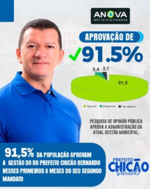 Uma recente pesquisa de opinião pública realizada pelo Instituto ANOVA revelou que a gestão do prefeito de Serra Redonda, Chicão Bernardo, alcança expressivos 91,5% de aprovação popular nos primeiros seis meses de seu segundo mandato.